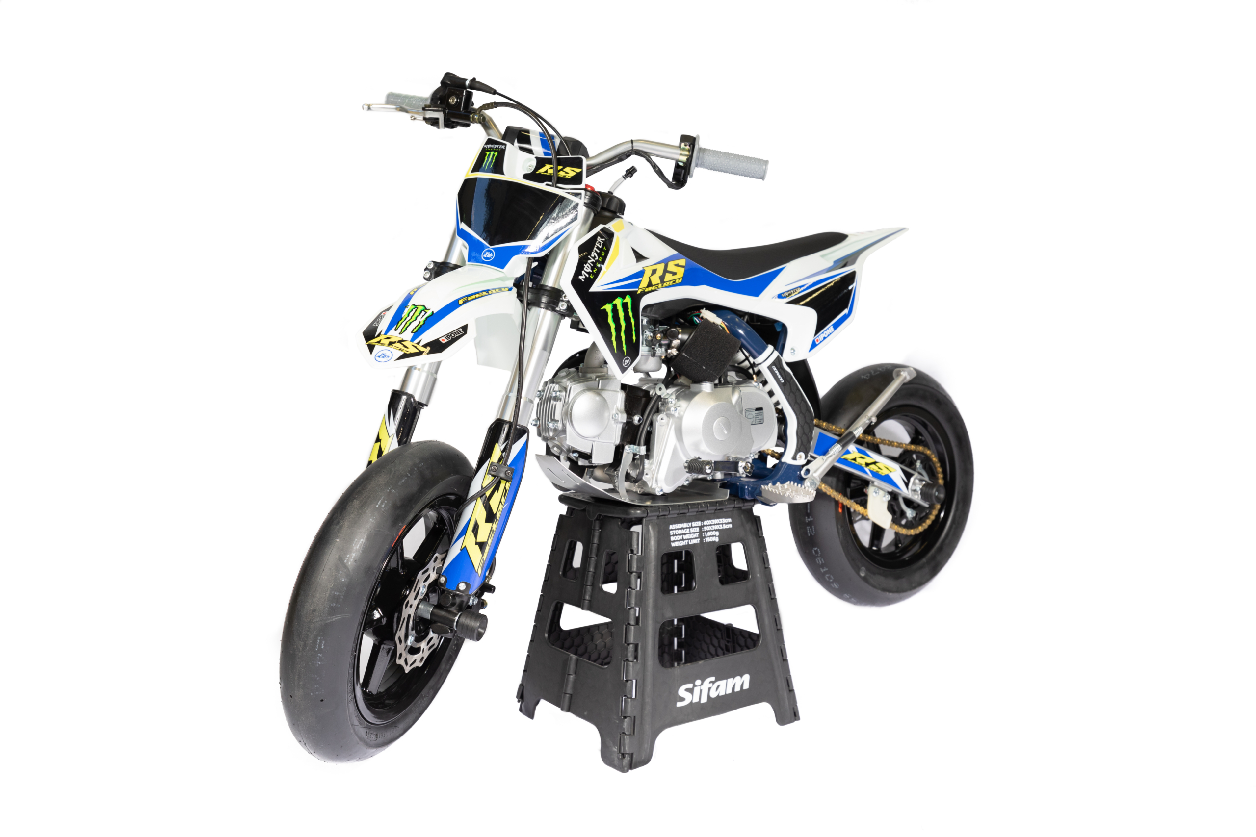 – Guidon avec barre de renfort , nouvelle ligne d’échappement avec silencieux équipé de DB Killer, kit récupérateurs essence / huile , tampons de roues gros diamètre ( modèle utilisé par les pros en location ), protège-mains.