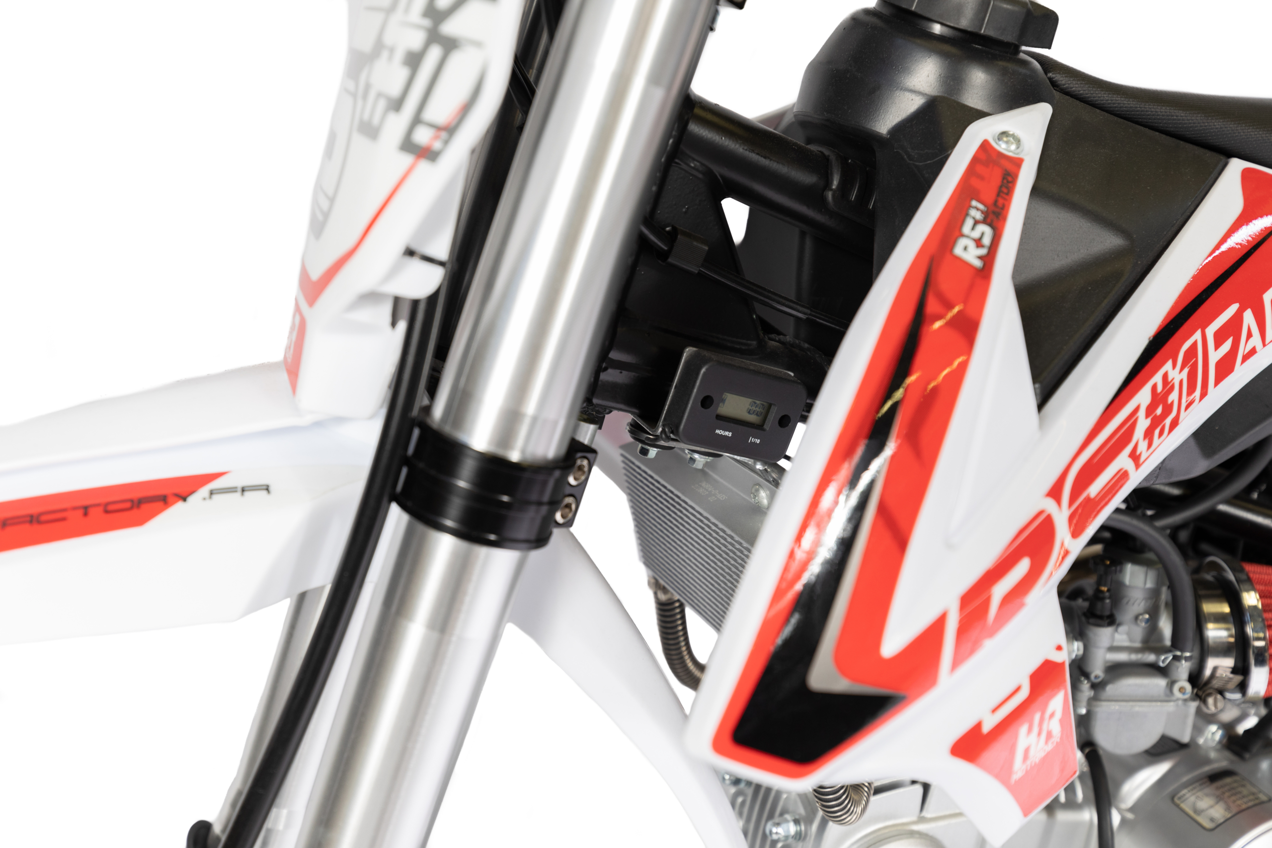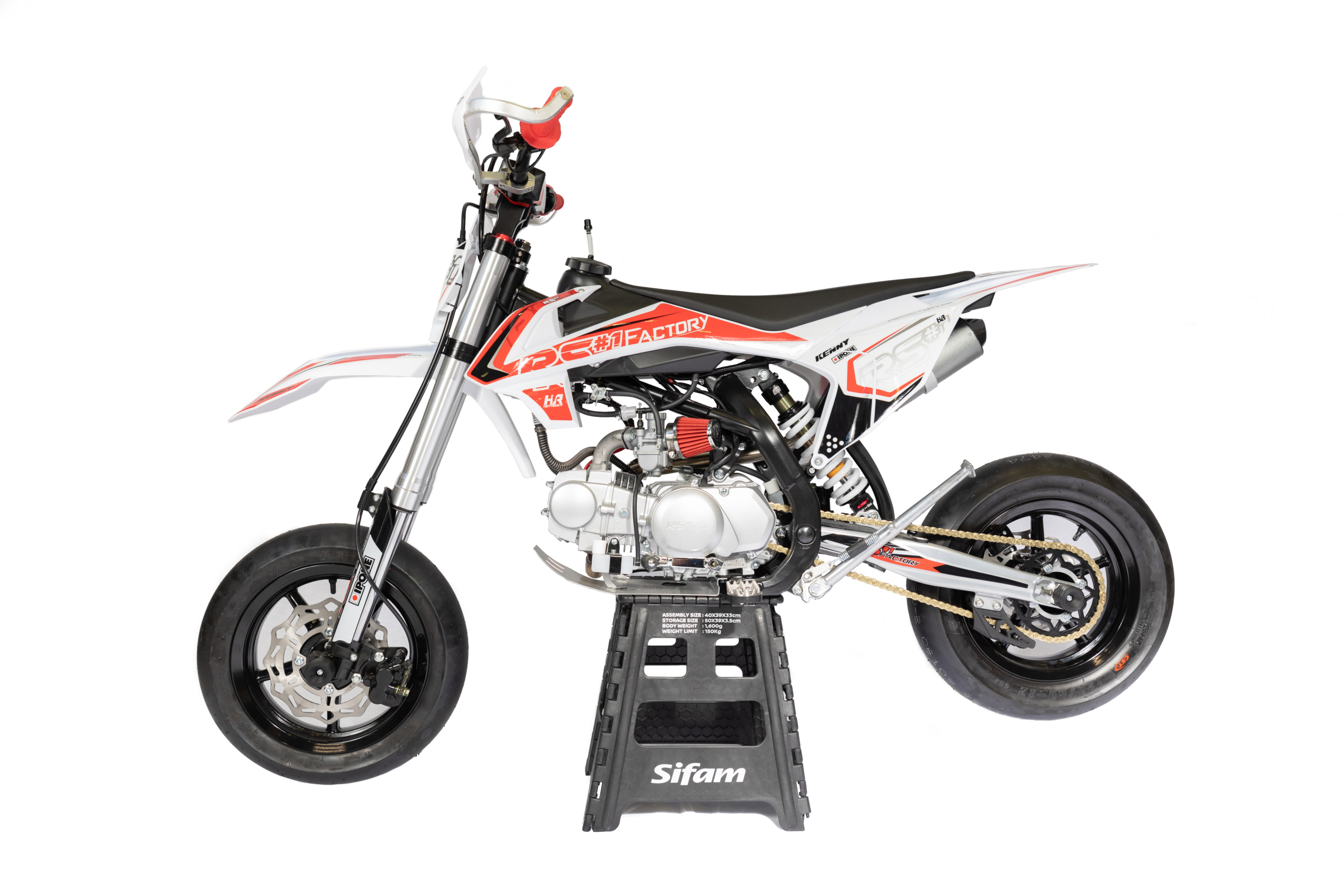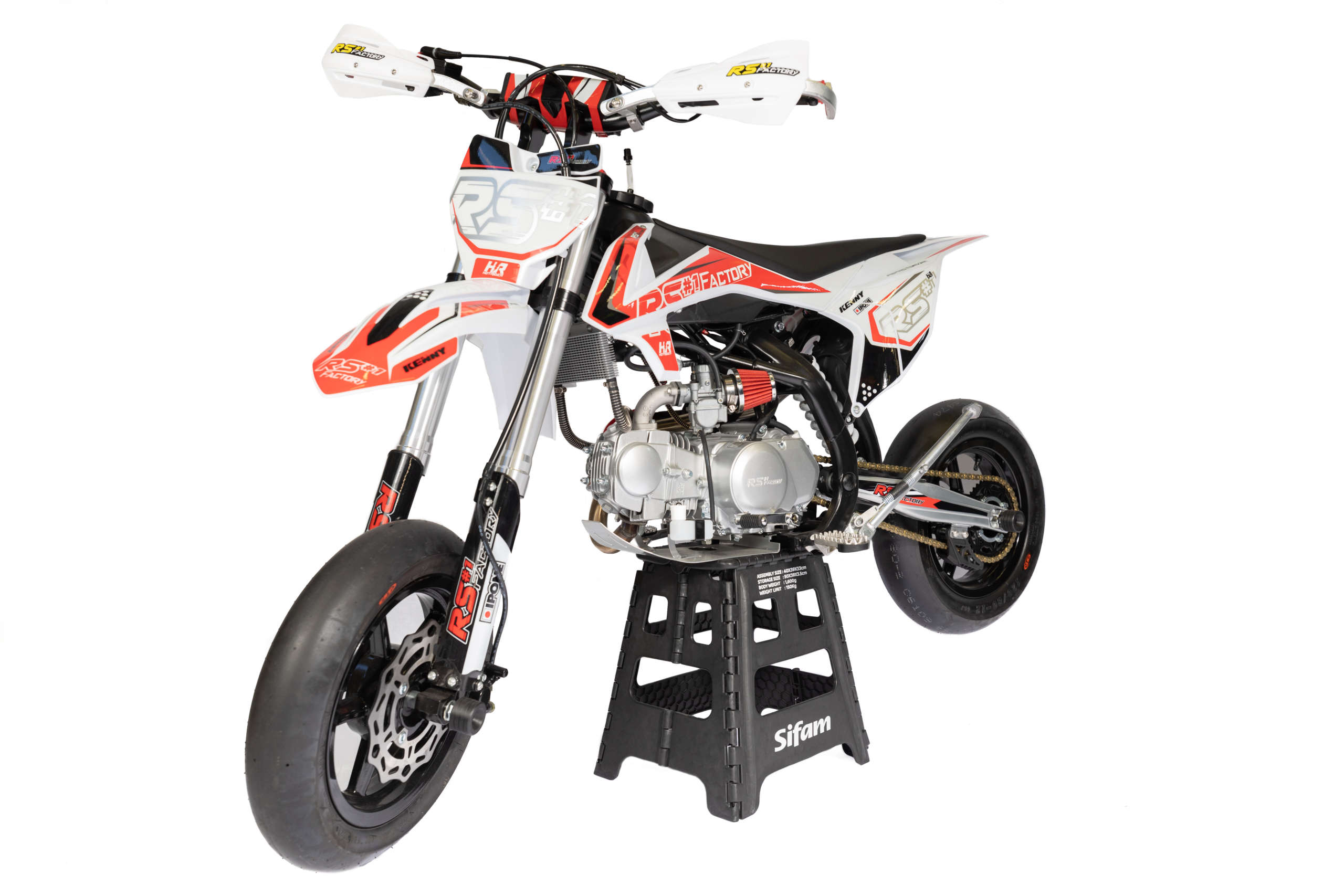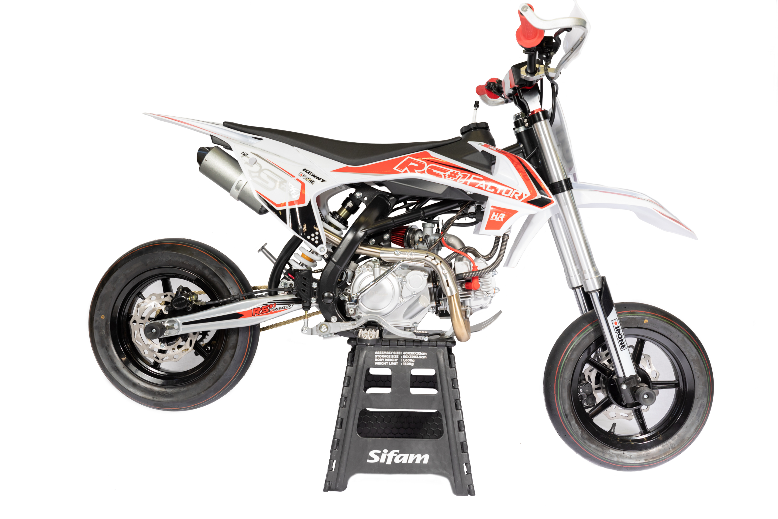 Equipement Divers : Guidon Diamètre 28.6mm / Pontets et tés CNC anodisés Noir /Béquille / Protection de maître cylindre / Kick Racing / Protections axes de roues Av et Ar / Réservoirs récupérateur essence/ huile / Protèges-main / Cale-pieds Inox avec protection Nylon/ Pédale frein AR avec protection Nylon